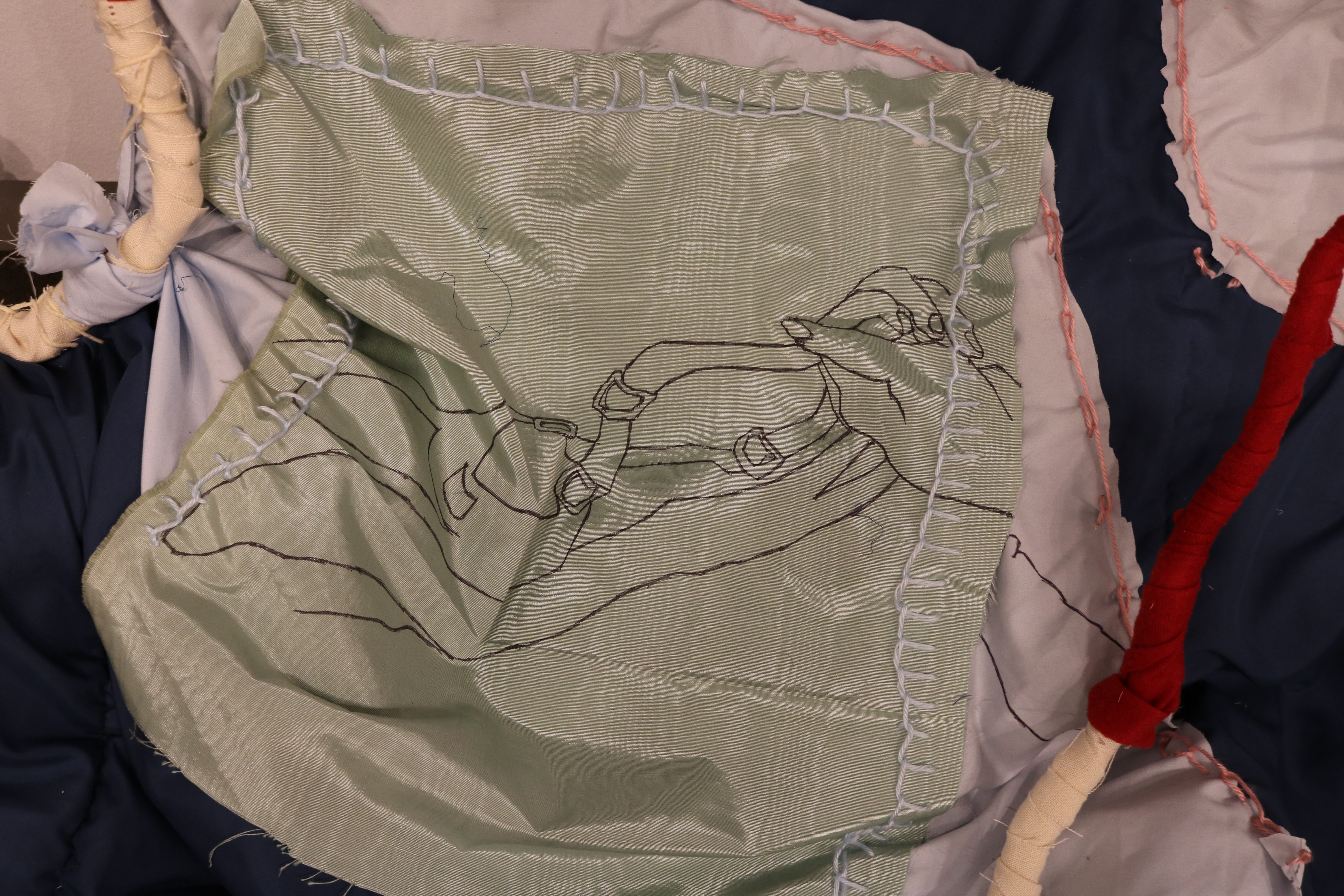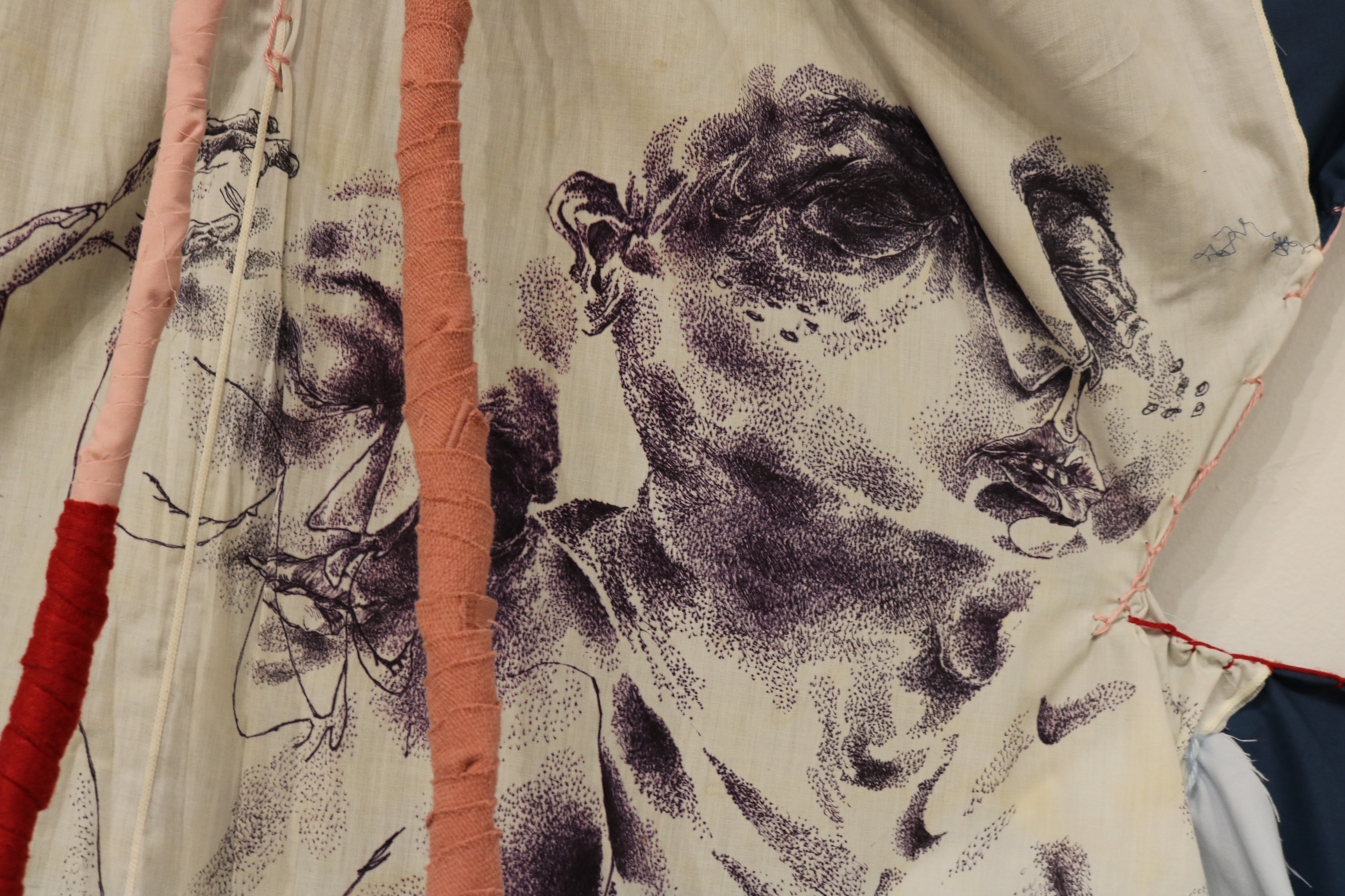 pen and ink, bedsheets, hand-felted wool, cotton cording,
