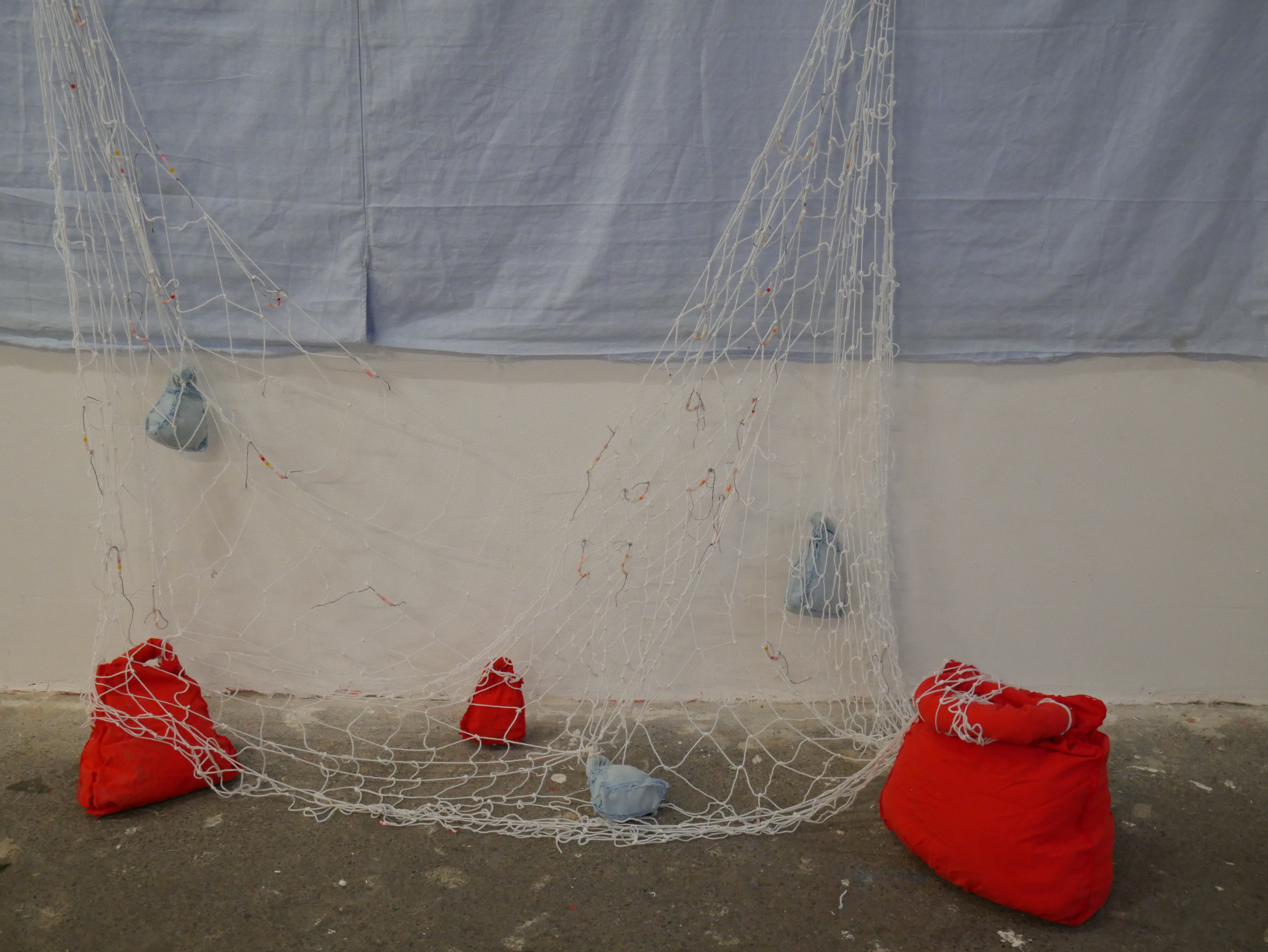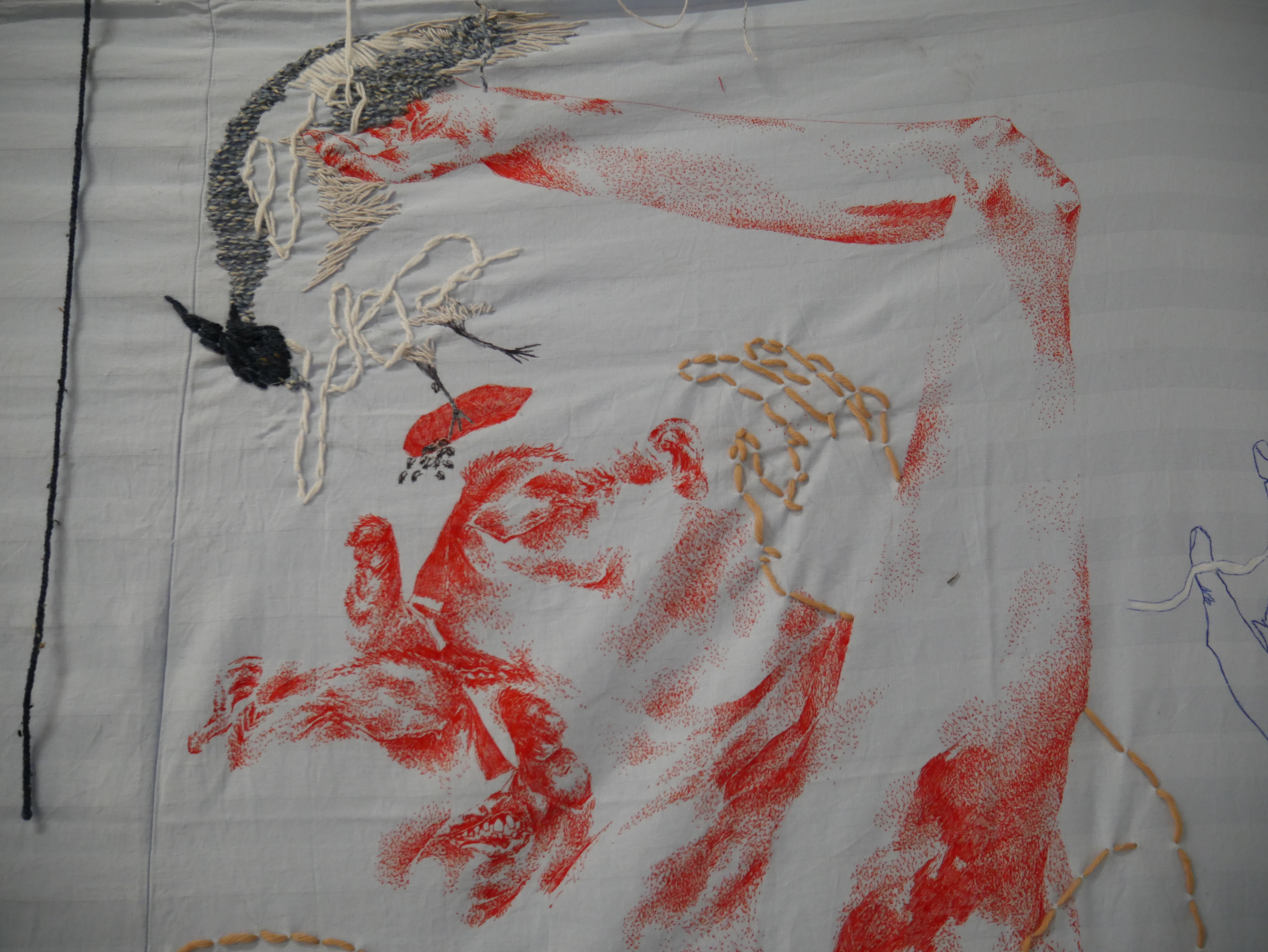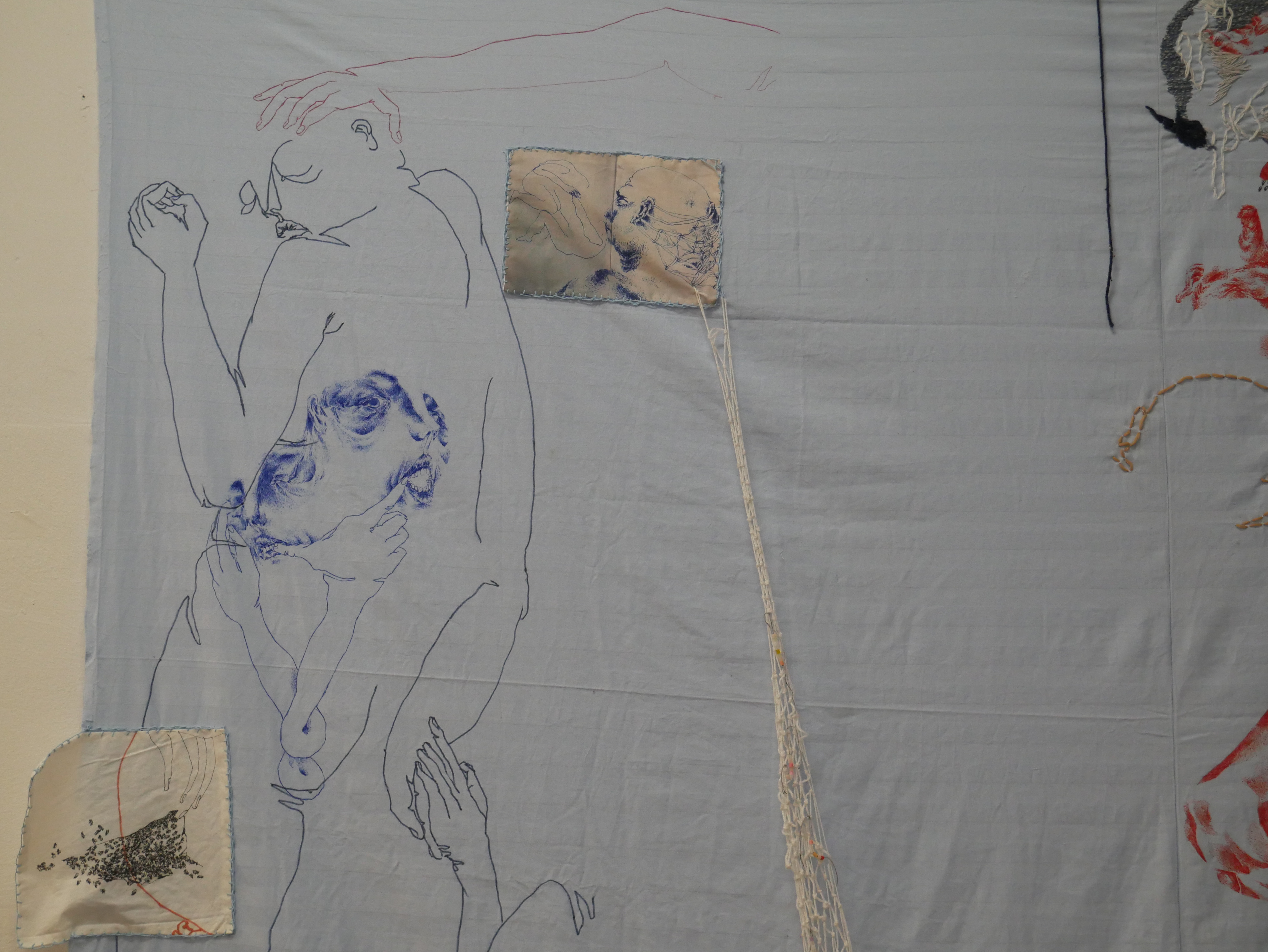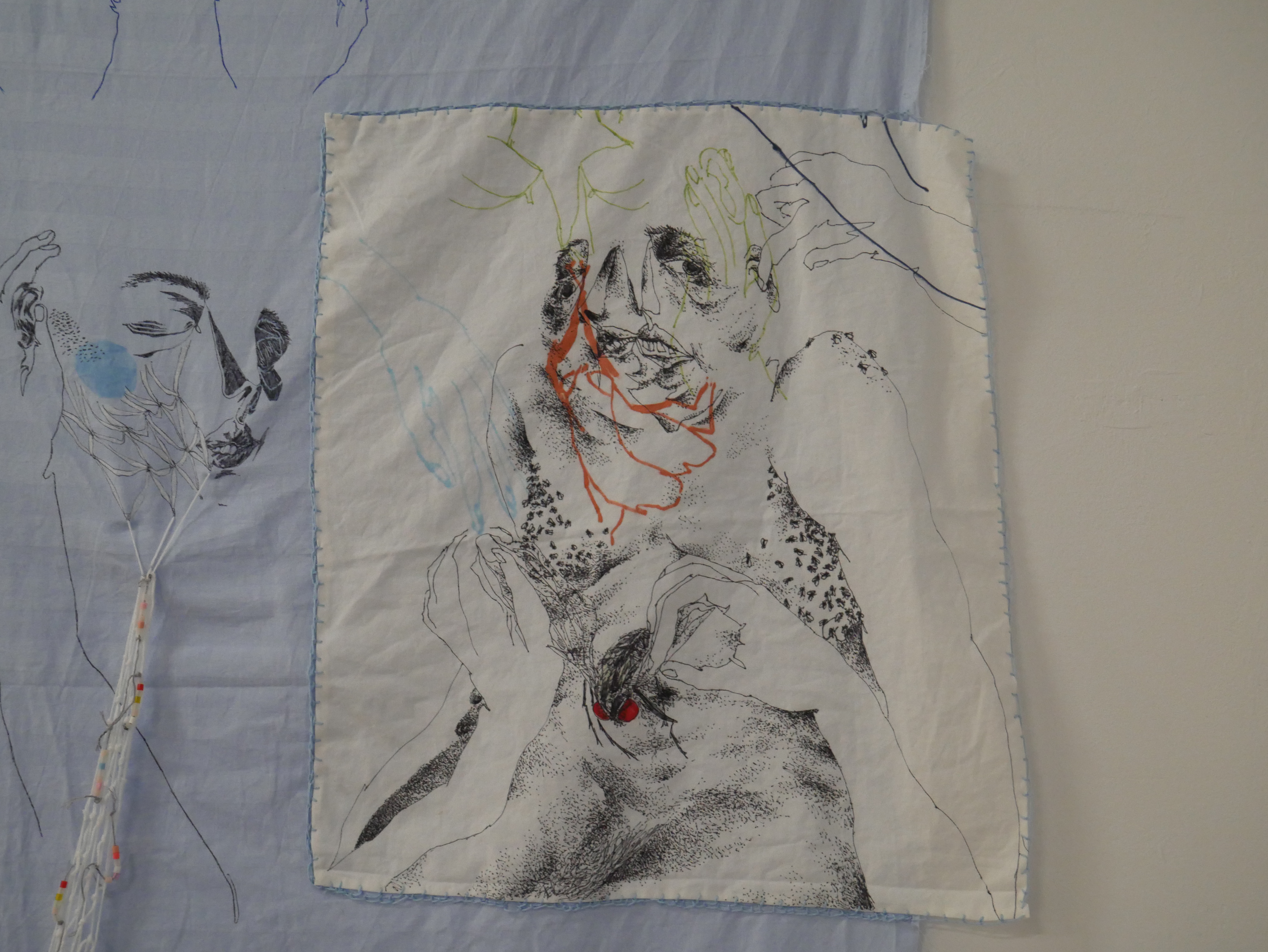 found objects, colored pencil, and digital print on used bed sheet
