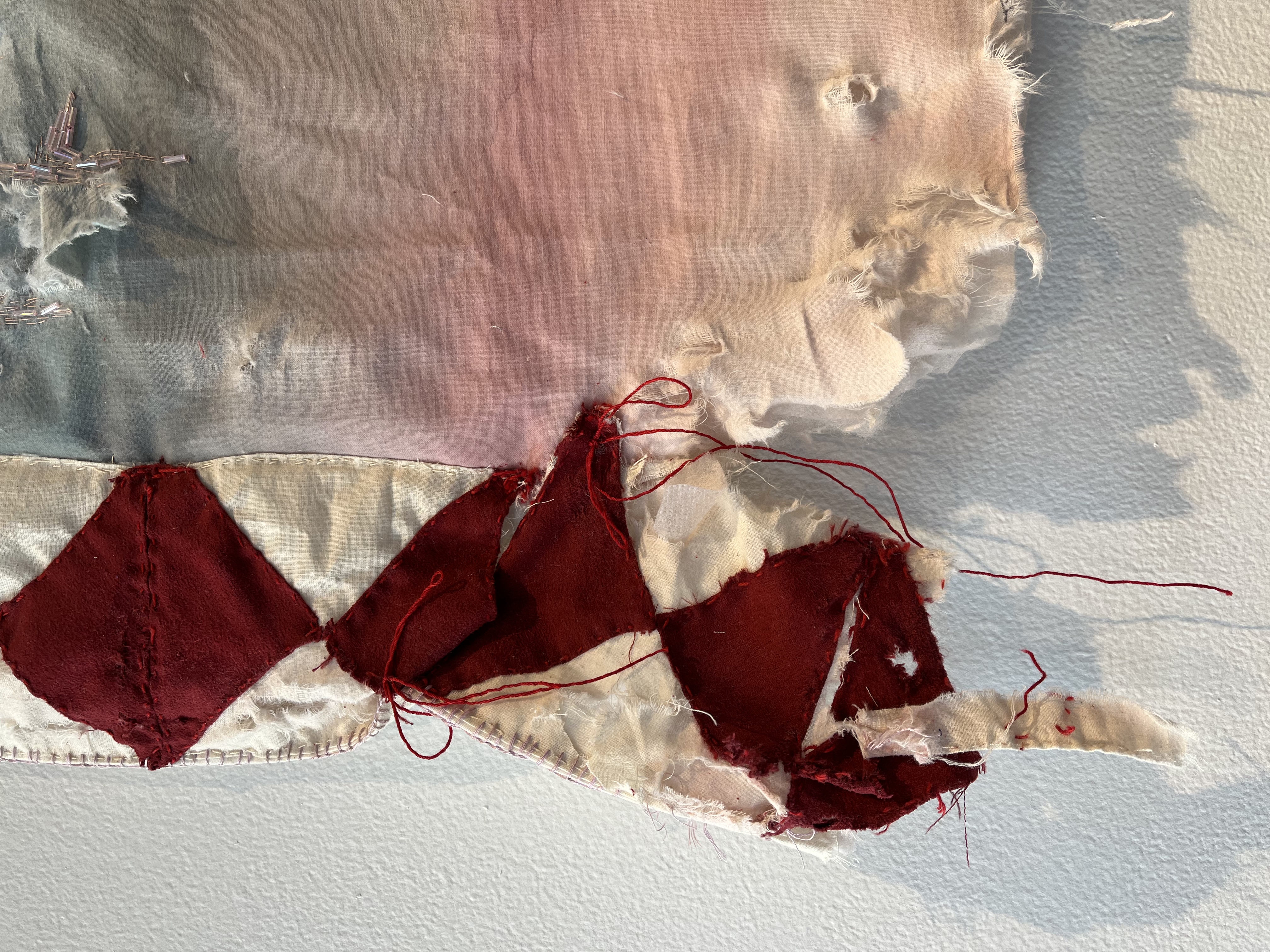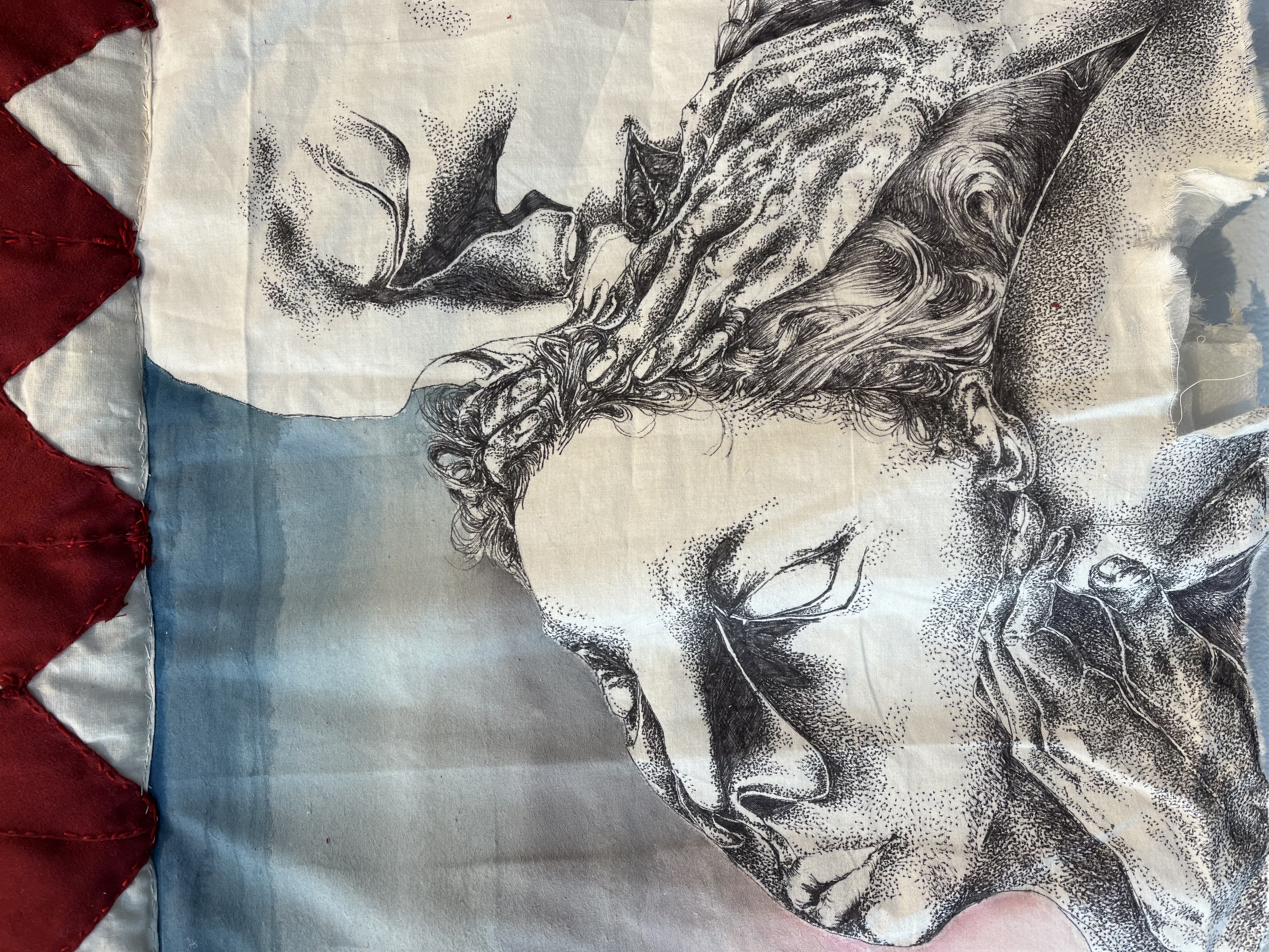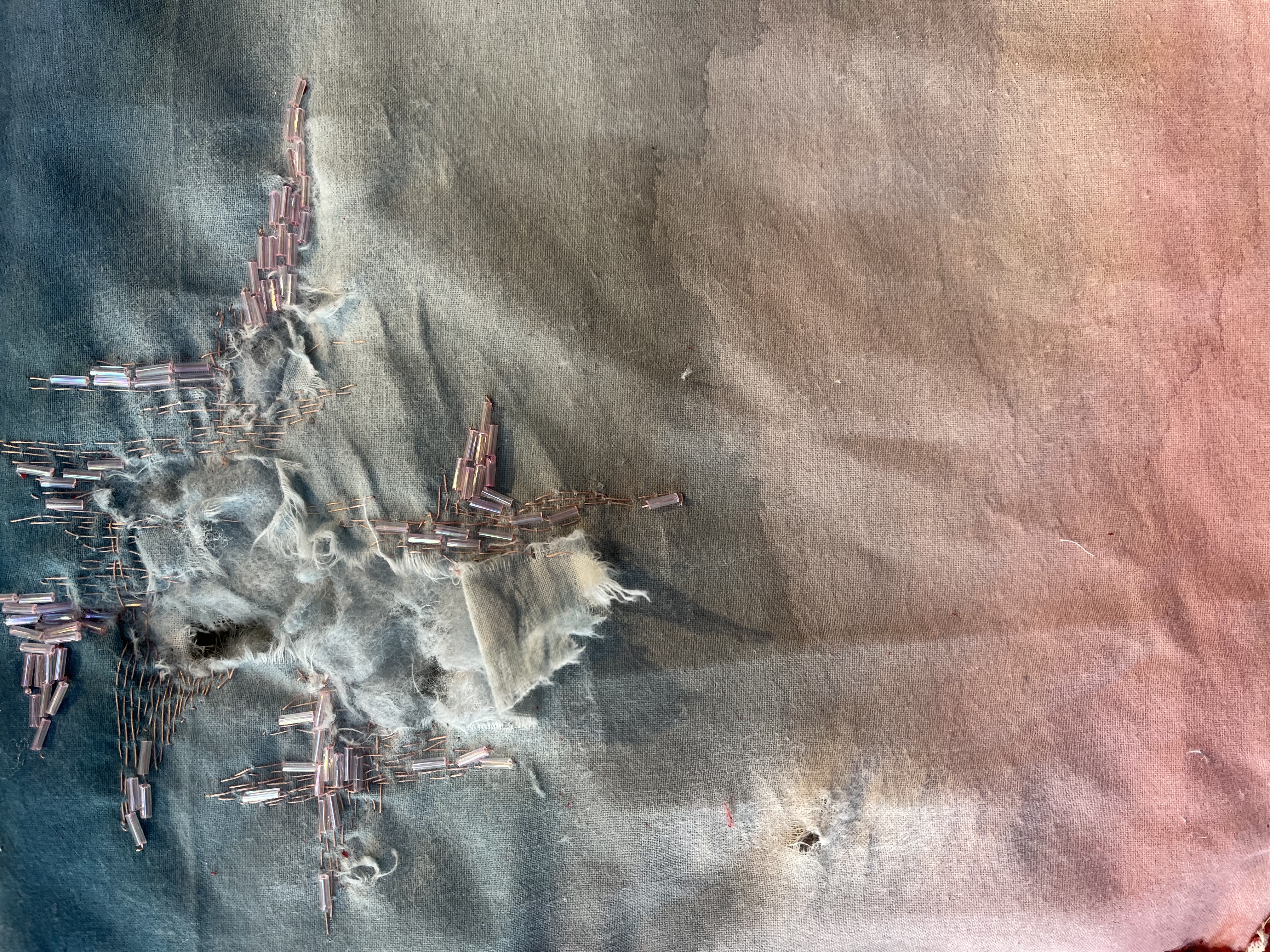 Pen and ink, watercolor, cotton batting, glass beads, embroidery floss, muslin, suede
